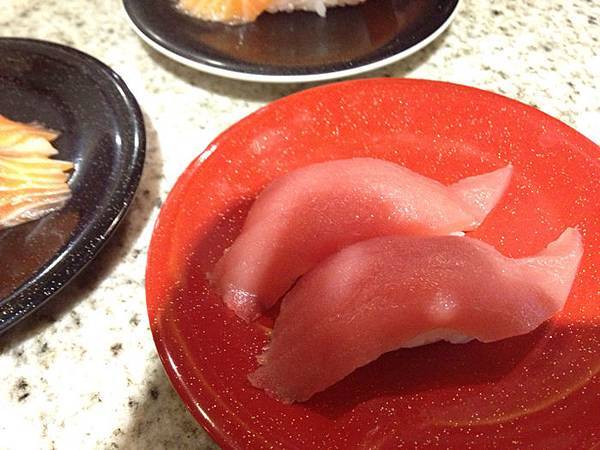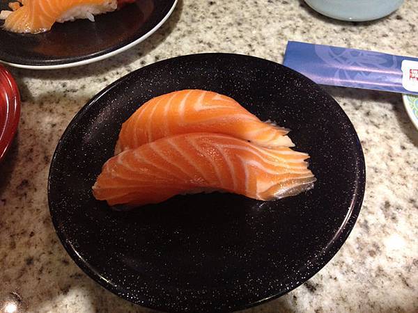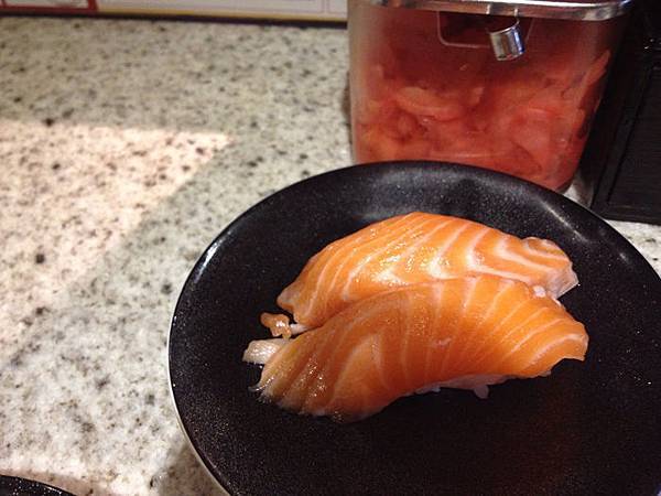 我們坐定位立馬拿了二盤我最愛的鮭魚握壽司,這邊握壽司都符合正統握壽司的作法,兩邊魚肉都長到蓋住醋飯,呈現扇形的狀態,鮭魚吃起來完全沒有魚腥味,肉質本身帶點脆度和甜度,真的是很新鮮說