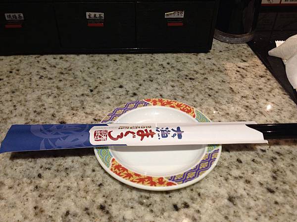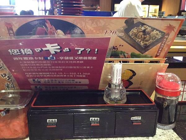 就定位後,吧檯用餐區的擺設其實跟爭鮮差不多,但比爭鮮好很多的地方是,前面的小抽屜有3種日式茶包可以讓你選擇,有玄米茶、烘培查、還有一種我忘了!